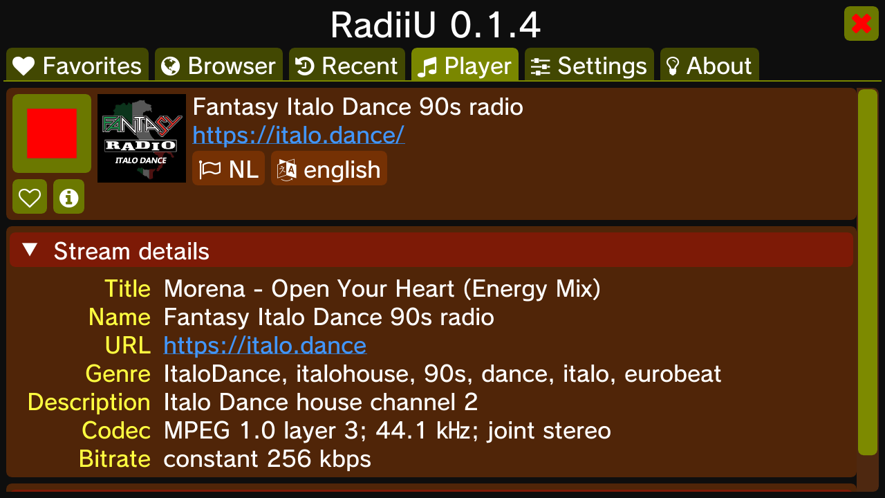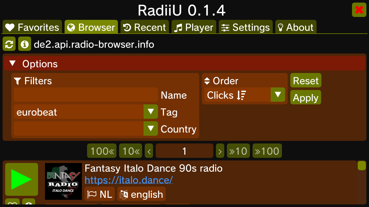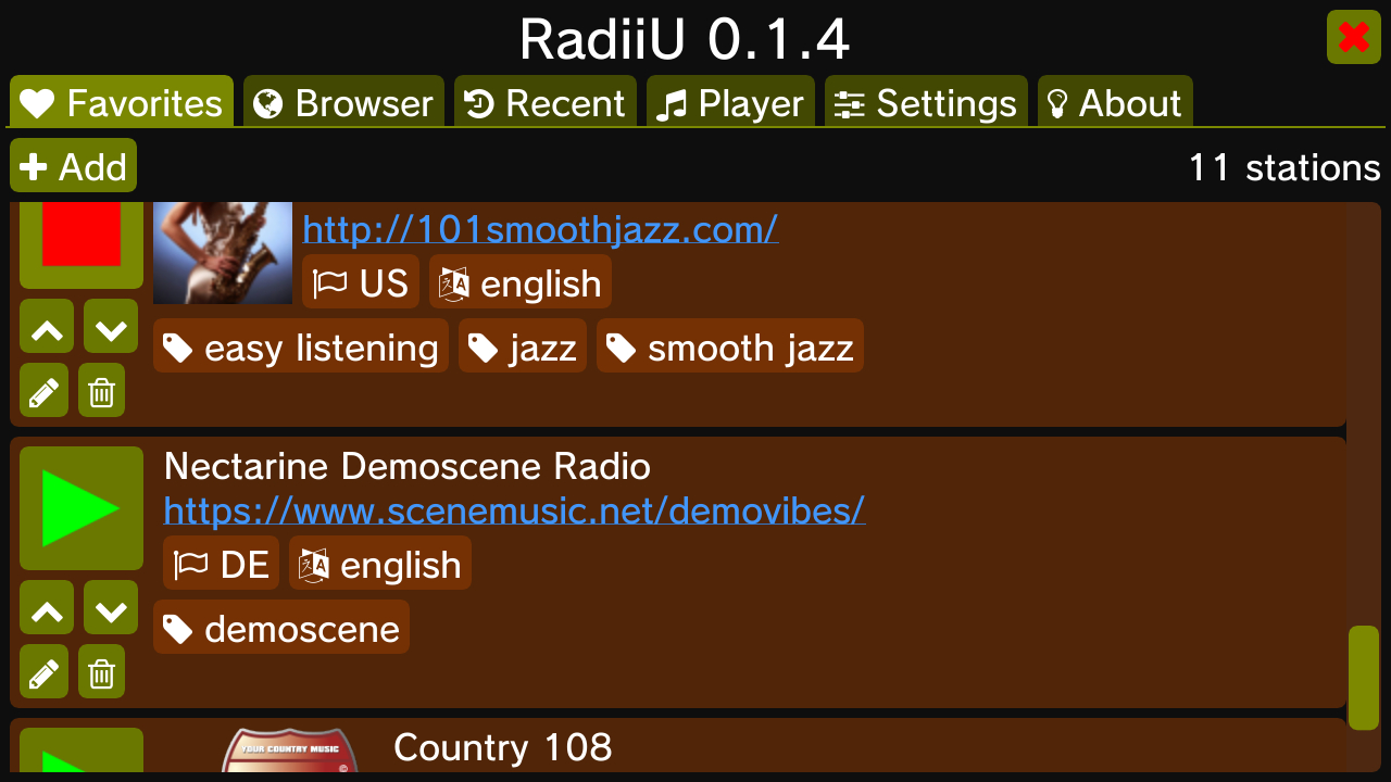 Radio stations are obtained from https://www.radio-browser.info/, but you can also manually add your own station.